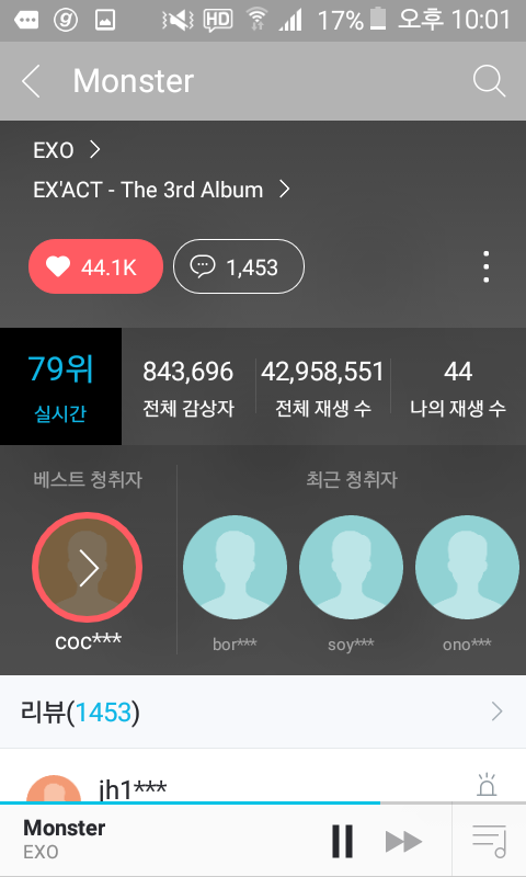 총 이용자수 온갖 머글이 세달째 제일많이 듣는 돆애비 오에스티보다 많음