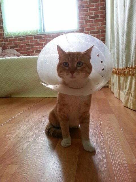 다리를 다쳐 목에는 카라를 쓰고 있지요