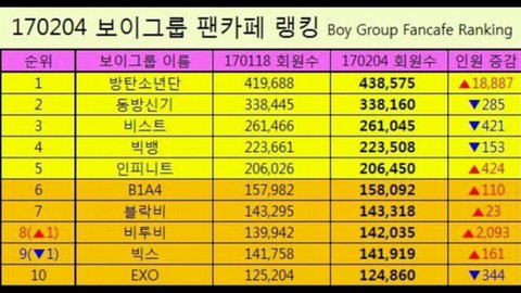 이거 2월4일날까지의 남자 아이돌 팬클럽 회원수라는데 방탄소년단이랑 비투비쩐다...