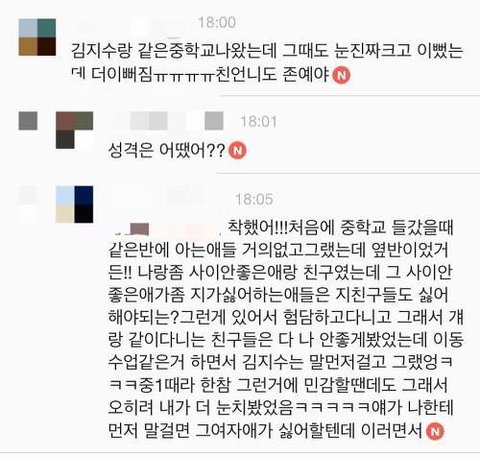 6. 과거 지수와 같은 중학교나 고등학교를 나온 사람들도 똑같이 예쁘다라는 말 밖에 없어! 그리고 증거자료는 없지만 페이스북에서 지수 글에 지수와 같은 중을 나온 동창이 중학교 때도 지금과 하나도 다를 게 없다고 했어!