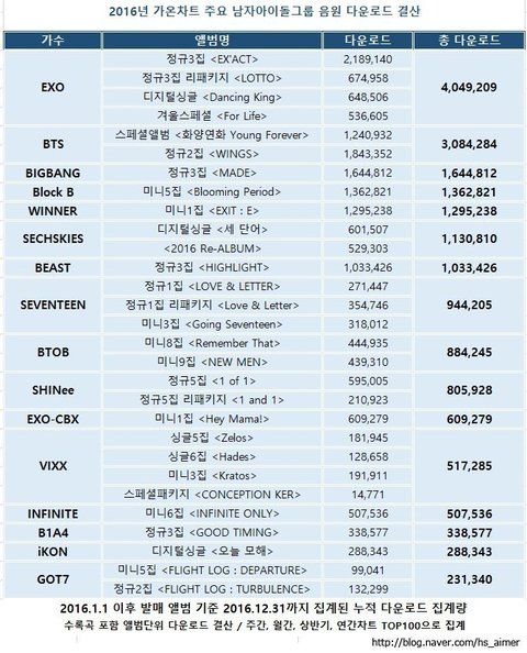 2016 다운로드 기록인데 우리 위로 음원이 특출나게 강력한 ㅂ비슷흐같은 그룹말곤 1년에 낸 음원이 2개 이상임....