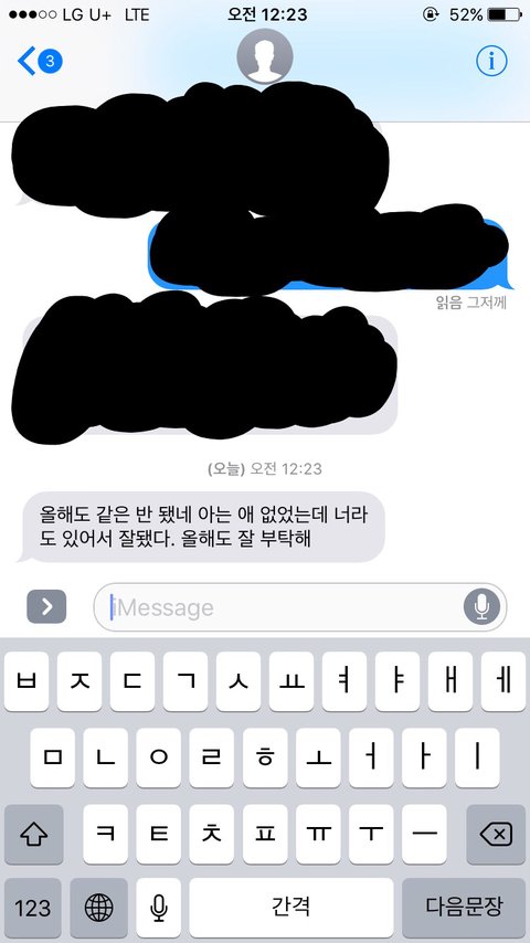 아까 12시에 학교 홈페이지에 반배정이 떴는데 진짜 감사하게도 짝남이랑 같은반 됐단말이야ㅠㅠㅠㅠㅠㅠ ㅈㄴ표현도 못하고 혼자 발광하면서 좋아하고 있는데 문자왔어ㅠㅠㅠㅠㅠㅠㅠ