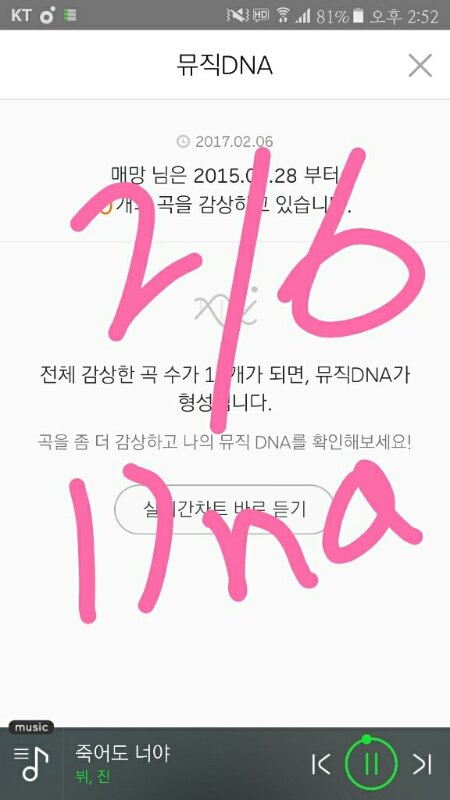오늘 스트리밍권 결제했는데 계속 스밍 돌리고 있어... 다른 곡도 들었는데 왜 뮤직dna가 안 뜰까 ㅠㅠ