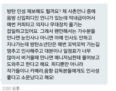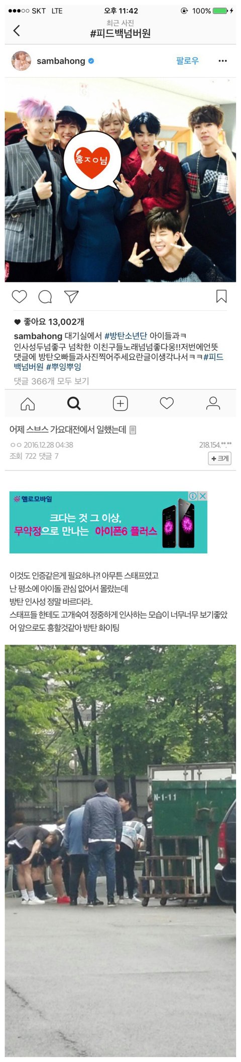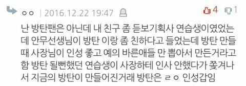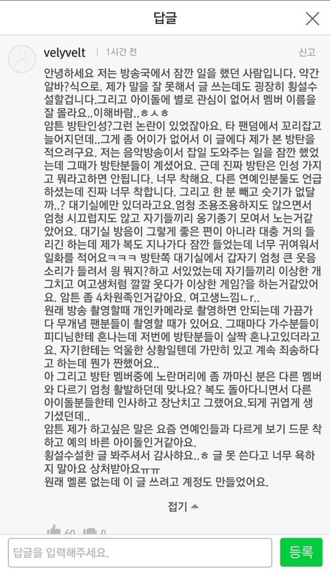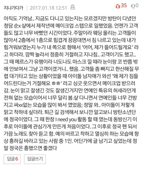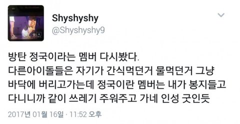 어그로때문에 혹여나 마음 흔들리는 이삐들 있을까봐 올려 위에 올라온 글들도 몇 개 빼고 인증이 확실히 되어 있는 썰은 아니지만 그 점은 저쪽도 피차일반 똑같잖아? 누구 말을 믿을꺼야? 몇 년 간 함께 달려오며 우리에게 한결같은 믿음을 준 방탄이들을 믿을래 아니면 같지도 않은 인증 들이밀며 이것이 사실이다 주장하는 저들의 말을 믿을래? ㅅㅅ 글 나도 읽어봤는데 그 중 가장 어이없는 말이 우리 애들이 방송국 관계자들한테 욕먹는다는 말이더라 이거 보고 확신했어 쟤네 말은 믿을 게 못된다고 이삐들아 흔들리지 말자 방탄이들은 팬인 우리가 더 잘 알잖아 안그래?