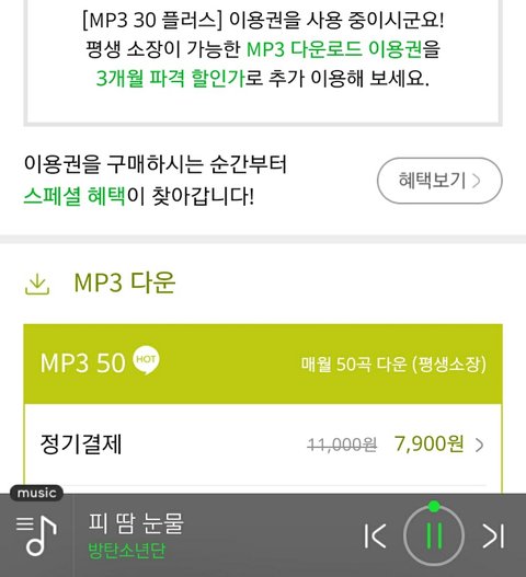 멜1롱 이용권 스밍 + 30곡 짜리로 바꿔ㅛ당.. 30곡으로 바꾼건 내 손이 시켰다 ^_^