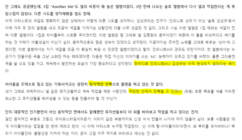 1집때 솔직히 가사 몇 줄만 적고도 작사/작곡에 참여했다면서 갑자기 무리하게 탈아이돌 래퍼로 탈바꿈할 수도 있었는데 엽덥은 진짜 앨범 퀄리티를 위해서 해야할 일과 안해도 되는 일을 잘 구분한달까? 저런 프로듀서들 섭외한 것도 기막히는데 'H는 아직 완성되지 않았다' 이말에서진짜 통수맞음..... . .