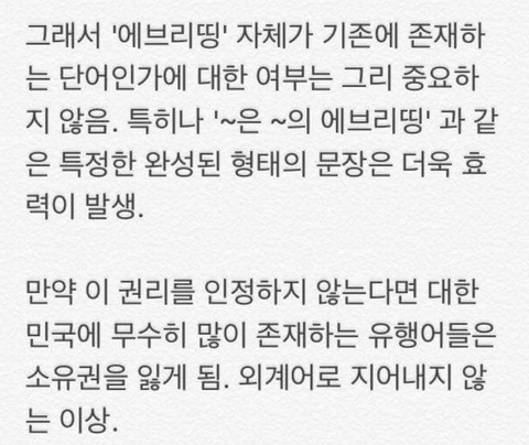 -> everything은 매우매우매우 흔한단어이고 이것에대해 저작권을 가진다는건 어느 별에서 온 말이지? everything에 저작권이 있어도 우리나라 사람들이 아닌 미국이나 영국같은 영어권 나라 사람들이 가지고 있을것이고 everything이라는 단어에 저작권을 가지고 있다는 것은 말이 안됨. 그러면 이 지구의 영어쓰는 사람들, 영어 책, 교과서, 문제지 다 저작권 문제로 법정 갔어야 함.
