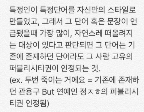 -> 이미 존재하는, 문법상 오류가 없는, 사람들이 일상생활에 써 왔던 문장이면 그 것은 고유의 퍼브리시티권이라고 하는게 아니라 '그사람 하면 떠오르는 것'이라고 까지만 인정가능. 그렇지 않으면 이세상 연예인이 쓴 문장들은 다 표절이 되나? (예; 정우1성의 잘생기면 짜릿해 -> 일반인이든 공인이든 이 문장을 썼다고 정우1성은 저작권 침해로 신고할 수 없으며 저작권을 요구 할 수도 없다. 단지 이 문장을 들으면 아 정우1성이 말했던 거 oo이 사용하는 구낰ㅋ 정도 까지 만 가능)