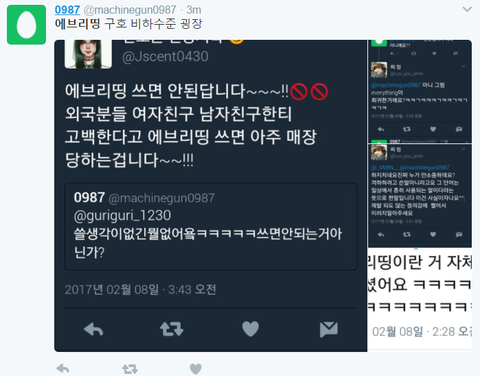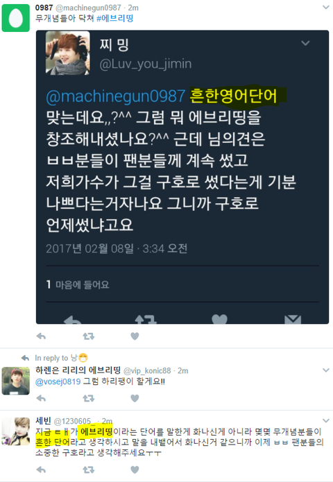 ->동의함. 우선 빅1ㅂ팬들의 논리부터 잘못되었음. 왜냐하면 에브리띵은 평상시에 쓰이는 매우 흔한 용어 맞고, 방탄팬들은 맞는 말 하고 있는 중인데 지금 그게 비하처럼 들리는 이유는 빅ㅂ팬들이 너무 이상한걸로 꼬투리 잡아서임. 뭐냐? 단지 everything 이 겹쳤다고 표1절이라는 거임.