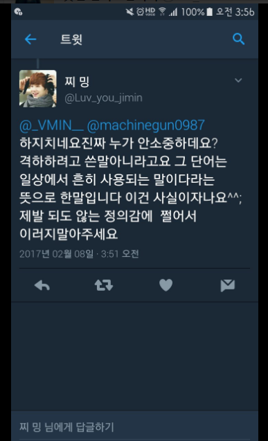 -> 예를 들겠음. 우리의 구호는 우지화. 근데 옛날에 ㅎ진영 분께서 ㅎㅇㅇㅎ 앨범을 내셔서 생각 없는 아미들이 엄청 깠음. 그래서 사태를 파악한 아미들은 아니라고 말리고 심지어 방탄도 ㅎㅈ영 응원 트윗을 올림. 그래서 지금 방탄구호가 화양연화라고 하는 타팬들있으면 일일이 베댓 만들어서 말해줌. "화양연화는 있는 말이고, 사자성어이며, 우리는 화양연화를 쓴다고 우리 구호를 베꼈다고 말하지 않는다. 우리의 구호는 우지화이다." 라고 말함. 증거는 다른글에서 올라옴. (링크정리글에 첫번째 링크)
