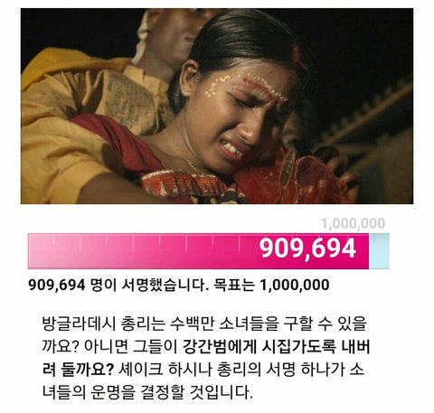 지금 방글라데시에서 강간 당한 소녀들을 강간범에게 강제로 시집보내는 법안이 통과될수도 있다고 합니다, 아직 목표 1,00,000명을 넘지 못했어요, 보신다면 링크에 들어가셔서 서명 부탁드려요.