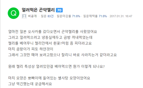 이것봐!!!!!!!!!!!!!!!!!!!!곤약젤리에 곰팡이같은게 생겼어!!!!!!!! 점점 커져 ㅠㅠㅠㅠㅠㅠ이거 먹으면 안되겠지?ㅜㅠㅠㅠㅠㅠㅠㅠㅠㅠㅠㅠㅠ