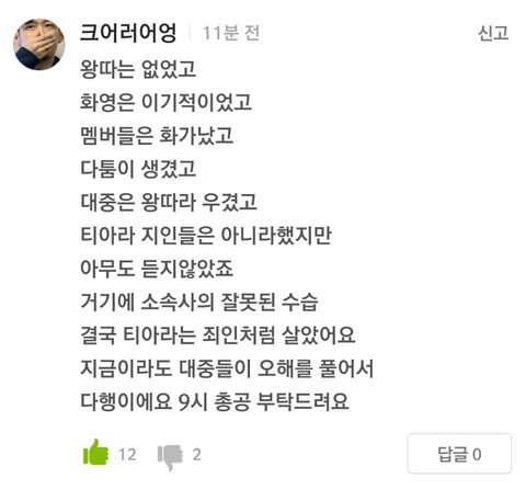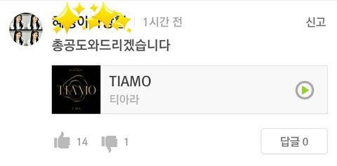 이번에 티아라 왕따 사건 진실이 밝혀져서 타가수 팬분들이 티아라 노래 "티아모(TIAMO)" 스밍 해주신다고ㅠㅠㅠㅠㅠㅠ
