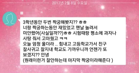 짝남이랑 4월달에 짝꿍하고 12월부터 마지막까지 또 짝꿍이였는데 난 4월부터 지금까지 좋아하고 있었지ㅣ..ㅎㅏ하...