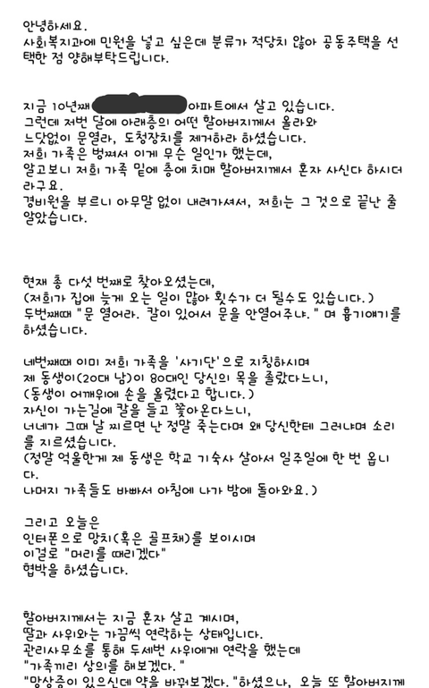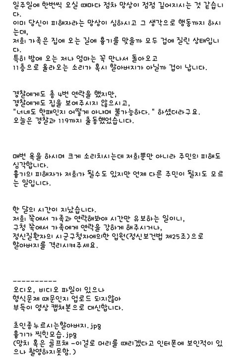 처음에는 엄마한테 전해듣고는 그러다 말겠지 하고 무시하려했는데, 점점 빈도도 잦아지고 문을 쾅쾅 두들긴다던지 골프채를 들고 올라왔다는 등의 얘기를 듣고 할아버지가 폭력적으로 변해가는 것 같아서 이러다 무슨 일이 나겠다 싶어 가족들한테 아파트 관리소장한테 말해라, 경찰에 신고를 해라, 구청에 민원을 넣어라 해서 가족들이 저 방법들을 모두 실제로 실행했습니다.