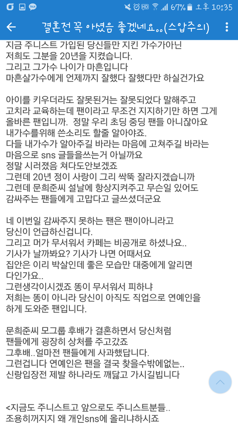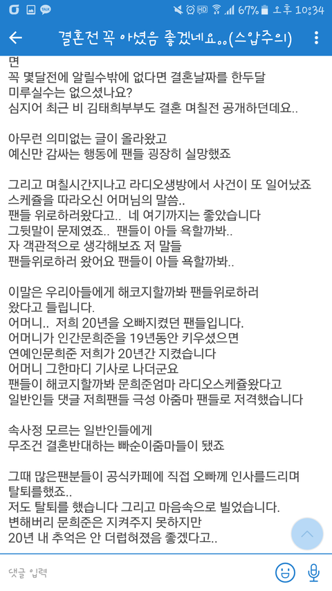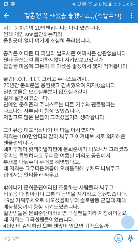 어머님이 인간 문희준을 19년 동안 키우셨다면 저희가(팬) 연예인 문희준을 20년간 지켰습니다 이말 진짜 너무 소름끼친다 팬들 진짜 대단한거 같음 기죽을까봐 추운 겨울 밖에서 몇 시간동이나 대기하고 나도 현직 아이돌 극성팬이라 음방이든 콘서트든 해봐서 아는데 진짜 힘들텐데 그 마음 지키고 20년 동안 지켜오셨으니 마음 진짜 찢어질거 같아 ㅠㅠㅠㅠ