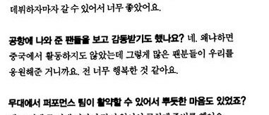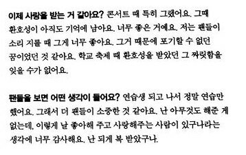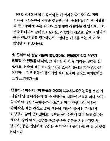 이렇게 인터뷰 몇개만 봐도 우릴 얼마나 생각하는지 알수있게 말하는애들이야. 더군다나 중소기획사에서 몇년간 힘들게 올라온 애들이라 팬사랑 각별하고. 우린 우리애들이 캐럿에 대해 어떻게 생각하는지 전혀 신경쓰고 걱정하지 않아도 될거같아