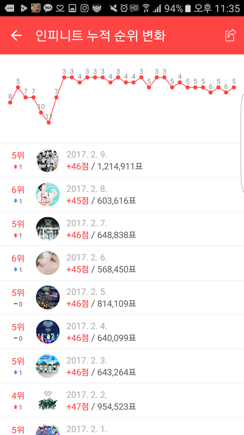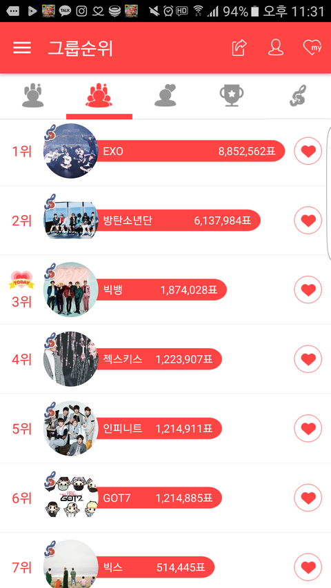 한번도 100만 넘은적이 없는데 오늘 120만을 넘겨버린거야!! 거기다 겨우 30표차로 ㄱㅅㅂ 분들한테 이김ㅋㅋㅋㅋ 넘나 짜릿한 것☆ 비록 ㅈㅅㅋㅅ 분들한테는 막판에 9000표 차로 졌지만ㅠ