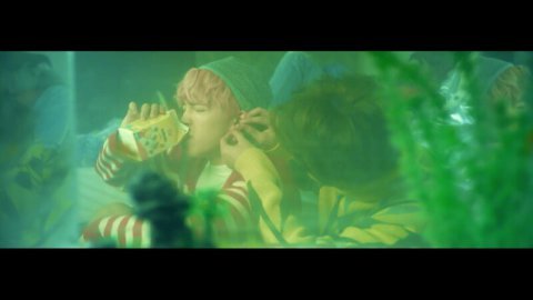 윤기 양치할때 초록 줄무늬 옷인데 누워있는 사진에 침대 끝에 기대있어