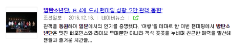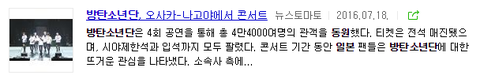 방탄소년단 14만동원(아레나투어+팬미팅.아레나투어 기사엔 안나와있으나 요요기 2일추가)