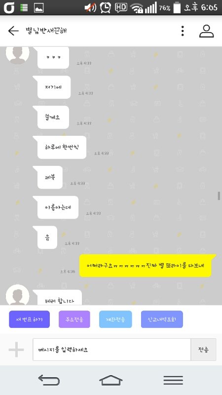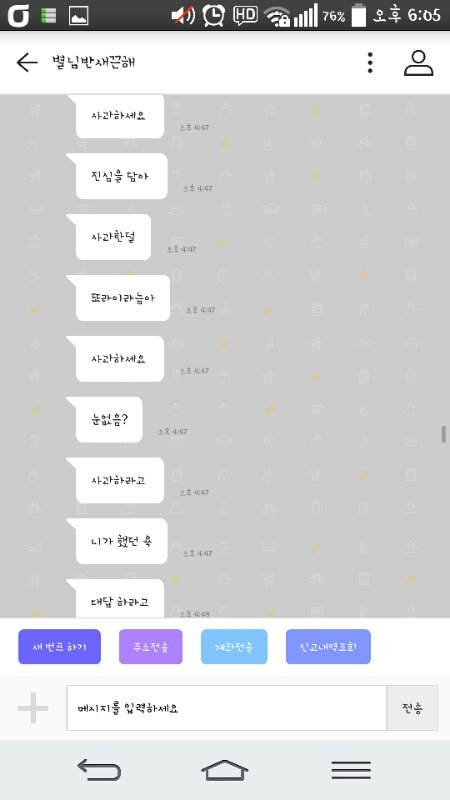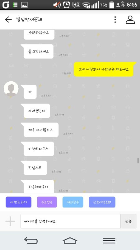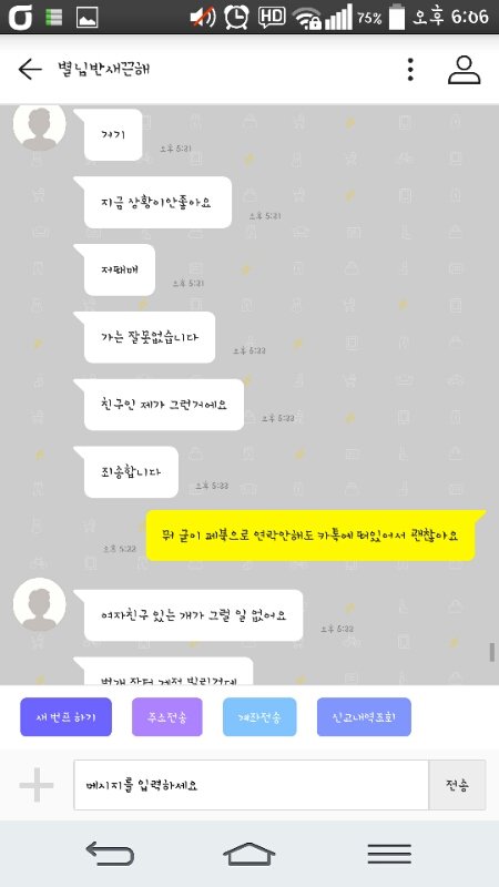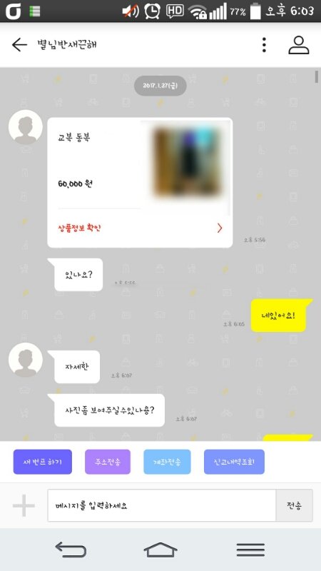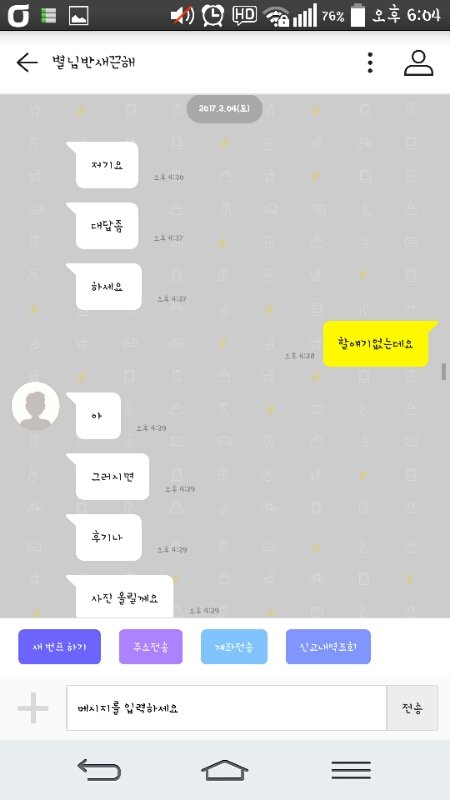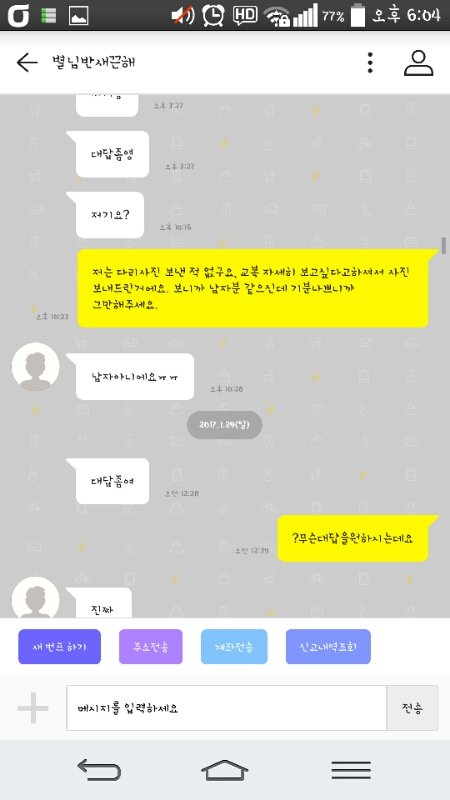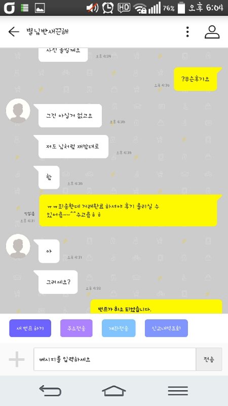 그 후에는 아무런 연락이 없어 A도 포기를 한 줄 알고 잊혀가고 있던 찰나, 갑자기 A에게서 연락이 왔고 A는 빨리 답장을 하는게 좋을 것이라는 식으로 톡을 보냈습니다. 저는 두려움을 느껴 답장을 했고 할말이없다고 보내자 그럼 A도 자기마음대로 할 거라는 식으로 톡이 왔습니다. 저에게 후기를 이상하게 작성할 거라고 하셔서 저는 거래완료를 하지 않으면 후기를 적을 수 없다고 했습니다. 그러자 상품문의칸에다가 갑자기 댓글을 달기 시작하셨고 그럼 여기다가 올릴거라고, 빨리 답장하라고 하셨습니다. 그리고 저에게 제 페북 이름을 안다고 하셨습니다. 그래서 저는 정말 화가나고 무서워서 별또라이를 다 본다고 얘기를 했고 갑자기 A는 화를 내며 사과를 하라고 했고 계속 협박식의 어조로 얘기를 하셨습니다.