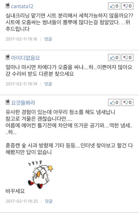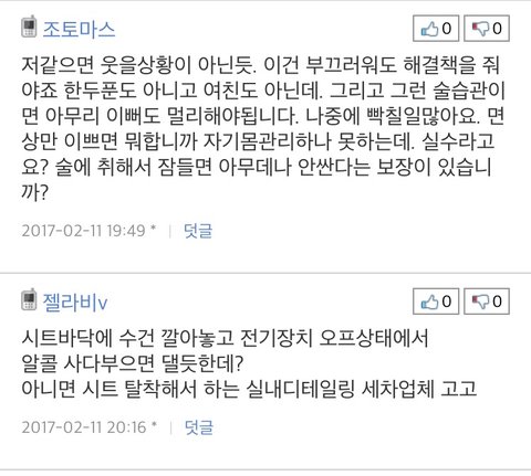 원글쓰니 귀여운뎈ㅋㅋㅋㅋ근데 여자는 좀 어이없...부끄럽든말든 시트값은 물어줘야지... 차에대해 잘 몰라서 수리비 얼마 안들거로 알았나? 근데 중간에 이거도 침수차인가요? 웃기닼ㅋㅋ.ㅋㅋㅋ