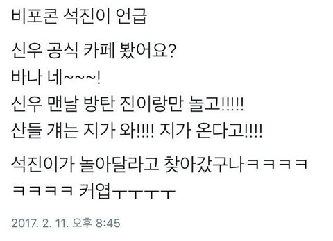걔는 지가 와!! 지가 온다고!!!ㅋㅋㅋ 놀아달라고 가는 석진이나 지가 온다고!!! 하시는 들님이나 둘다 귀여워ㅠㅠㅜㅜㅡ 둥이면 말해조
