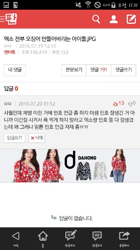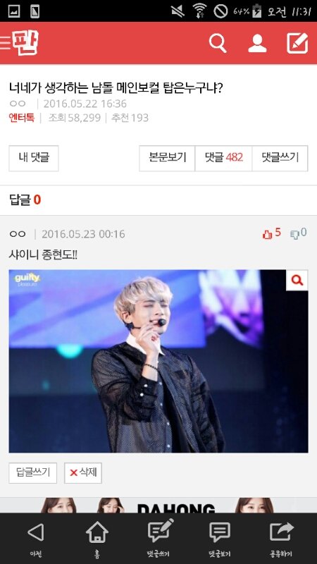특유의 "나만 별로야?" 이 말투로 은근슬쩍 까는 것도 보고 얼굴로도 까고 (심지어 팬들 얼굴도) 인성논란 만들고 맞지도 않는 자료 들고와서 까고... 근데 더 충격적인 건 추천 수가 반대 수보다 월등히 많다는 거임 베플도 같이 동조하고 있고... 요즘 방탄이랑 트와이스 진짜 잘 나가는데 판에서 이러는 거 보면 판까흥은 사이언스인 거 같다 언제부턴가 잘 나가는 아이돌은 판에서 한 번 이상 까이더라 타팬인 나도 그런 글 보면 눈살 찌푸려지는데 아미랑 원스는 기분 어떻겠냐 제발 입장 바꿔서 생각해 봐 샤이니가 그렇게 까인다고 생각하면 난 진짜 판 부수고 싶을 듯