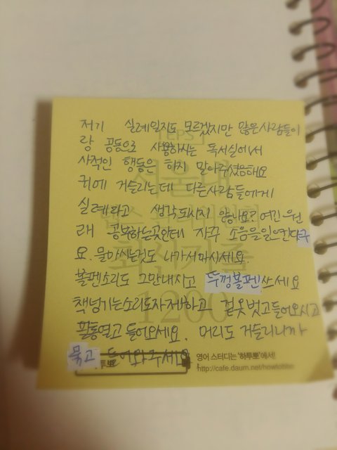 이렇게 쪽지왔는데 ㄹㅇ 너무 억울해서.. 화난다 해야하나?볼펜 똑딱 하루에 10번도 안하는데...물도 소리안나게 빨대로먹고 책도 조심스럽게 넘기고... 돈아까워 다다음달부턴 집에서..