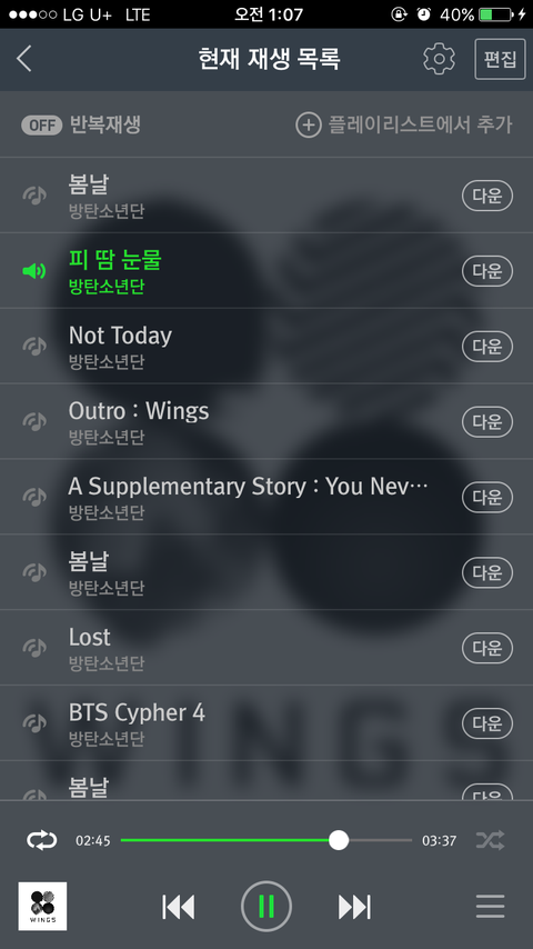 컴터로 개별곡 다운했는데 폰으로 스밍하고있는거
