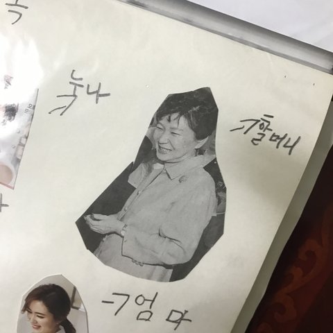 학교에서 신문 잡지? 그런거 가지고 우리가족 상상 하기 그런거 있었나봐 ㅋㅋㅋㅋㅋㅋㅋㅋ 근데 할머니 사진이 없었는지 박근혜 사진으로 함 ㅋㅋㅋㅋㅋㅋㅋㅋㅋㅋㅋㅋ 나랑 엄마랑 보고 조카 웃겨서 ㅠㅠㅠㅠㅠㅠ