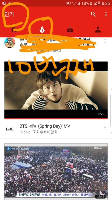 너튜브 인기동영상 10번째에 봄날 뮤비 있어ㅜㅜ 너튜브 인기동영상 상위에 가수 뮤비 뜬거 갠적으로 첨보는데 괜히 좋다ㅜㅜㅜㅜㅜ