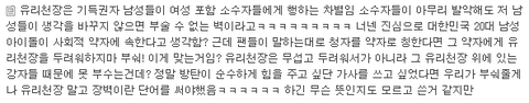 실제로 내가 쓴 댓글에 달린 대댓이야. 내가 반박댓 또 썼는데 안 봤을 것 같아서 여기 쓴다. 저 댓글 말고도 비슷한 내용의 댓글들 꽤 봤는데, 니네가 뭔데 소수자고 아니고를 판단해? 잘나가고 인기많고 돈 많으면 소수자 아닐 줄 알아? 여전히 같잖은 이유로 방탄 까는 사람들 많고 그것 때문에 방탄도 팬들도 진짜 힘들었고 상처도 많이 받았어. 방탄 뿐만 아니라 모든 아이돌들 악플로 고통받는단 점에선 다수의 대중들에게 고통받는 소수자야. 너네야말로 그런 악플들로 인한 고통 겪어본 적 없으면서 함부로 입털지 마.