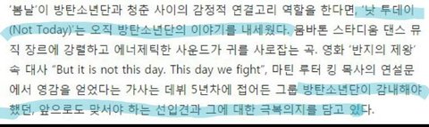 이런 댓글을 정말 많이 봤는데 방탄 가사가 의미하는 바가 정말로 여성/소수자에게 하는 말이였다면 맞는 말임. 그러나 그게 아니란다.낫투데이는 방탄 자신들의 이야기이고 그게 가사에 충분히 드러나 있음. 숨어 있는 것도 아니고 대놓고 자기 이야기라고 가사에 나타나있다고. 못 배우신 분들도 바로 알 수 있는 부분을 가져왔다.