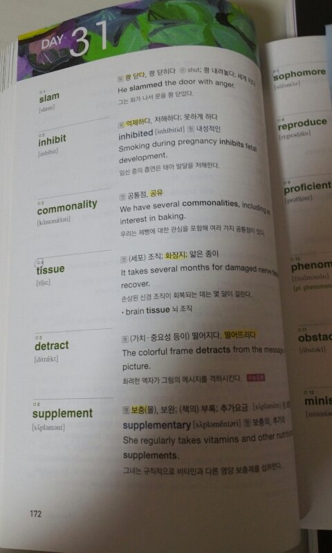 1) 제 단어책을 보면 한장에 12~14개 분량인데요. 저는 단어를 빨리 외우는 게 목적이므로 단어의 뜻을 단어당 하나씩 형광펜으로 칠해줍니다. 그리고 원래 알던 단어는 볼팬으로 동그라미 쳐줍니다.