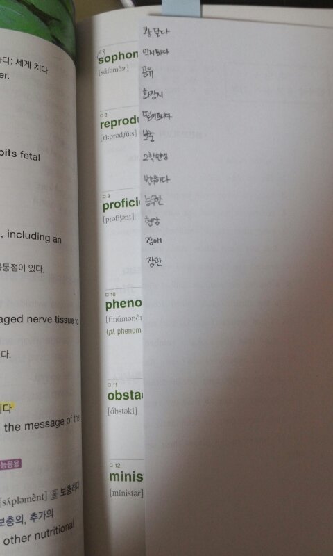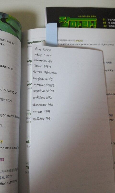 한 쪽면에 단어와 형광펜 칠한 뜻을 한번씩 적어줍니다. 물론 그냥 적으라는게 아니라 자꾸 읽으면서 생각하면서 적어야합니다.