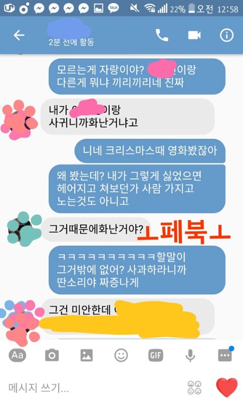 아 그리고 헷갈려 하는 얘들 있던데 핑크색 페메는 여자얘랑 한거고 파란색은 전남친이랑 한거양