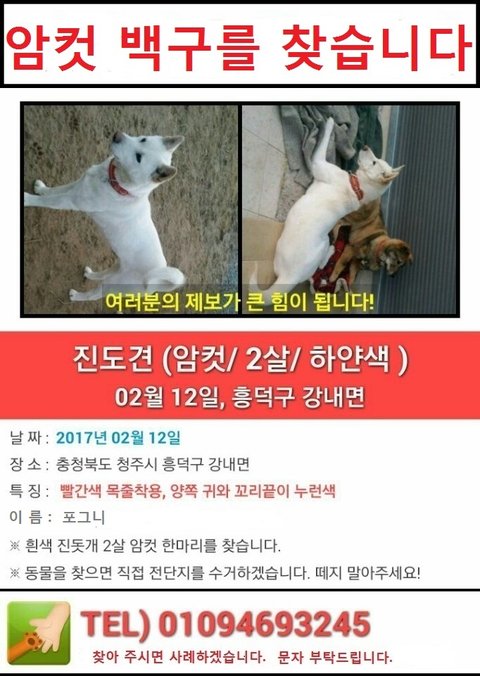 부모님께서 마당에 풀어놓고 키우시는 개인데 2017년 2월 12일 아침 새끼 한 마리와 같이 실종되었습니다. 4개월 가량된 새끼는 12일 오후 3시경에 집으로 돌아왔으나 어미인 백구는 아직 돌아오지 않고 있습니다.