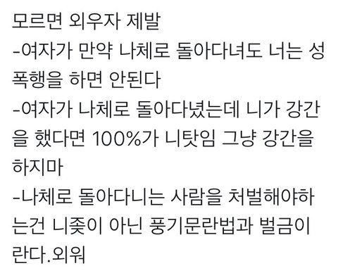하..ㅋ 진짜 너무 열받아서 제가 "아니 강간 당한거는 100% 남자 잘못 아니냐고 단둘이 있을 수도 있지 그럴때 강간한 남자가 잘못 " 이라고 그랬죠.