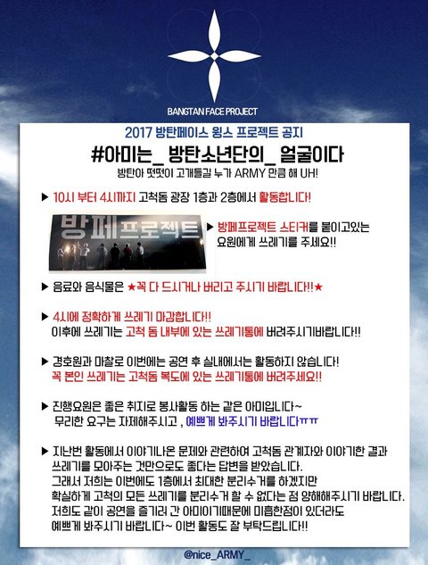 안그러겠지만 혹시라도 쓰레기같은거 바닥에 버리지말고ㅜㅜ 같이 참여해서 좋은 이미지 심자! 원래 착하고 이쁜 아미들이지만 이런모습을 보이면 일반인들도 우리뿐만 아니라 방탄이들에대한 이미지도 좋아지지않을까?하는 나의 개인적인 생각이야