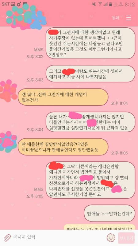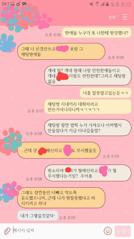 학원앞자리년들이 학기말에 빨강이랑 나랑 둘이서 잘다니는데 괜히 핑크가 빨강이랑 나한테 붙어서 나 곤란해지게 만든거아니냐고 핑크 좀 그렇다고 그얘기 한걸 저 문자보낸년이 들었나봄;;그래서 어제 물어보길래 어쩔수 없이 말하기 싫었는데 걍 대충말했음;;근데 조카 오지랖 부려 ㅅㅣ발