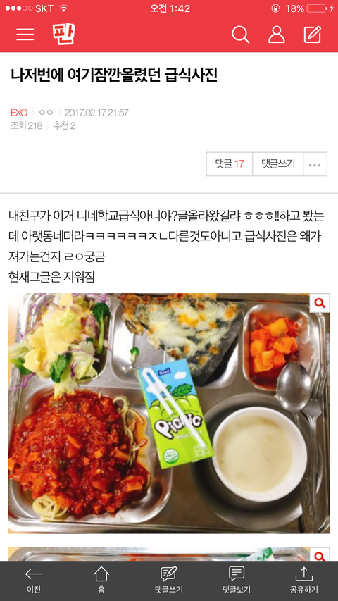 도대체이걸왜퍼가 ㅋㅋㅋㅋㅋㅋㅋㅋㅋ다른것도아니고 급식사진임 아까본애들은 알꺼 ㅇㅇ