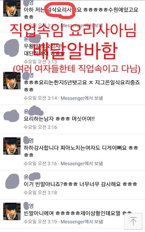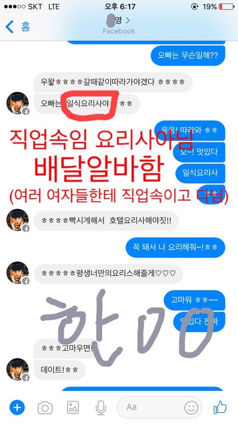 다음은 여자들한테 직업사칭(?)이라고 해야하나? 배달일 하는데 일식요리사라고 속인 증거들임