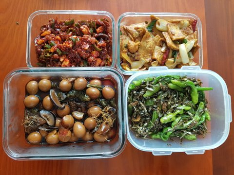밑반찬한 사진입니다. 가끔 장봐서 날잡고 만드는데 일본식 메추리알조림, 꽈리고추볶음, 어묵볶음, 그리고 낙지젓갈에 오이고추, 참기름, 마늘 넣고 무친 낙지젓갈입니다.