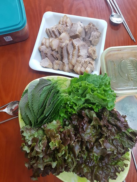 간단한 수육! 앞다리살을 된장, 생강, 후추, 월계수잎, 대파, 양파, 마늘, 엄나무, 커피 가루 넣고 이삼십분 삶으면 맛 좋은 수육이 짠!!