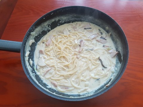 대충 큰 팬에 만들어 먹었습니다. 베이컨이 없어 스팸으로 했는데 맛의 차이는 있네요. 평소엔 루를 만들어 쓰는데 이번엔 치즈로 농도를 맞췄습니다.
