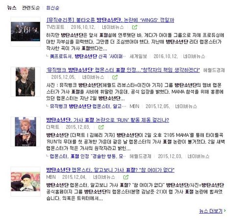 한참 논란됐었던 방탄 표절논란도 사실인 랩몬 가사 일부 표절만 기사뜨고 나머지 의상이니 뭐니 다 안뜨잖아.(캡쳐 좀만했는데 진짜 아무것도 안뜨냐고 태클걸려고하는애들은 너네가 직접 찾아보세요..) 5월에 ㄹㅇ 가관이었는데ㅋㅋㅋㅋㅋ방탄은 아직도 표절 엄청 했다고 알고있는사람들 꽤 있는것같던데 진짜 안타까울 따름임..