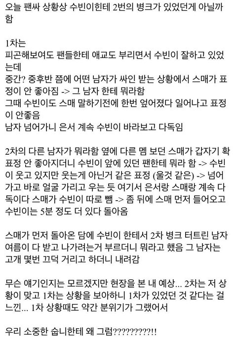 이런 일이 한두번이 아니었던게 다른 멤버 수빈이도 팬싸 도중 울음이 터져 나갔다 온적이 있고, 비밀이야 활동 때는 팬이 벌레장난감으로 장난을 쳐 보나가 놀라 우는 사건도 있었음