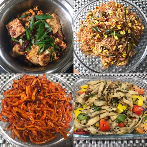 두부조림,콩나물무침,진미채무침,어묵볶음