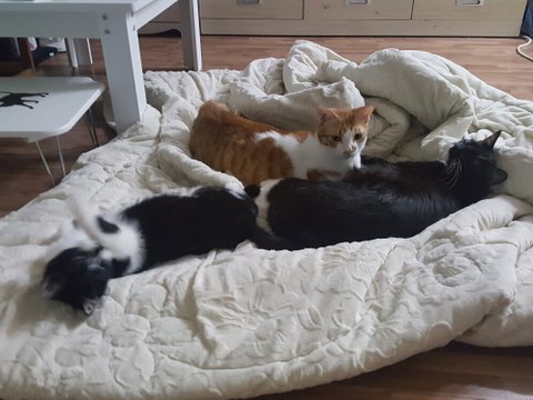 거실에 이불깔아놓고 잠시 자리비우면 나타나는 상황...집사따위 누울자리는 없....... 그래도 옹기종기 이쁜 내새뀌들ㅋㅋㅋㅋ